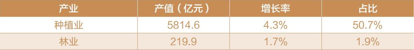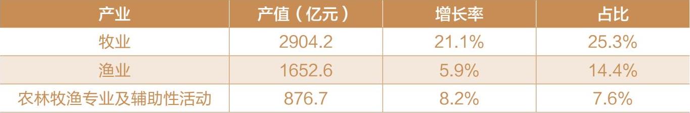 2021年山东省在原有基础上更进一步,农业发展稳中有增。农林牧渔业产值达11468.0亿元,按可比价格计算,比上年增长8.6%。具体各细分产业的产出情况见表2-2。