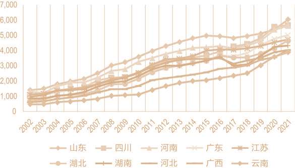 从增加值的角度来看,山东省农业也走在全国前列。2021年山东省农业增加值达到6029亿元,是上海市的60倍,是农业大省黑龙江的近两倍。图2-1为近10年来农业增加值前十省份农业增加值变动趋势,相比其他农业大省,山东省农业在绝大部分年份(除2020年)的增加值均居全国首位,并且山东省农业增加值的增长速度较快。
