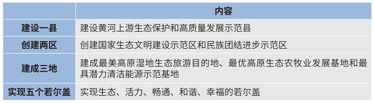 “十四五”期间,若尔盖县将立足国家生态安全承载地独特优势,把握“争先增绿、稳县富民”总基调,擦亮长征、黄河、生态“红黄绿”三个发展底色,全面实施“政策引领、投资拉动、项目推动、产业互动”四大发展方略,加快建成“一县两区三地五个若尔盖”。