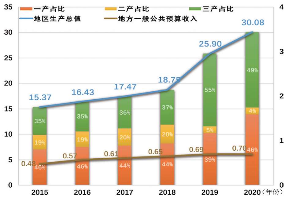 “十三五”时期,若尔盖县地区生产总值突破30亿元,第三产业产值占比提升近15个百分点。地方一般公共预算收入逐年增加至7000万元左右。