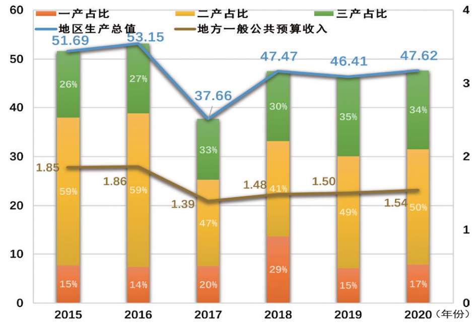 “十三五”时期,化德县地区生产总值持续稳定在65亿元左右,第三产业产值占比稳定在50%左右。