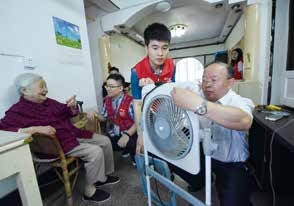 ■钱海军与志愿者们帮助老人维修电扇(姚科斌 摄)