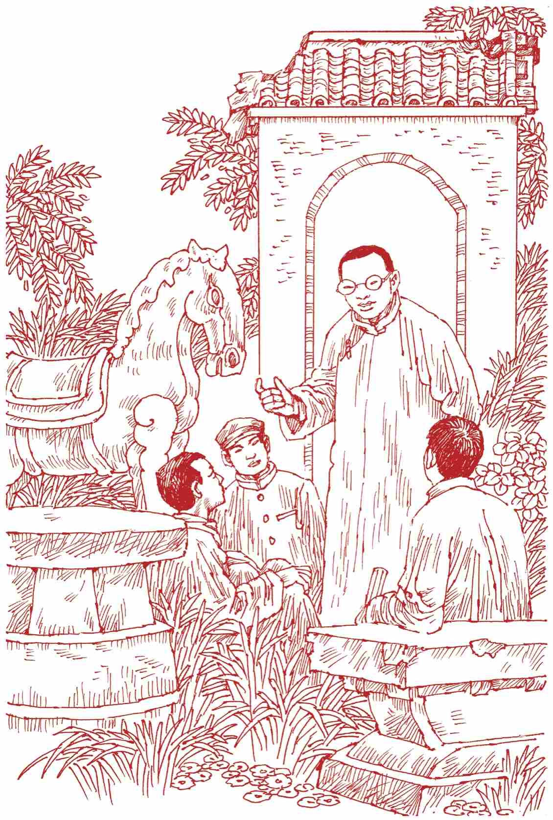 大家背靠背坐在石桌石凳上,兴致勃勃地谈论起他们这几年的事业。他们满怀信心地计划着怎样办好利群书社、怎样办好浚新小学,怎样建设中国……他们在“美丽蓝图”的憧憬中越谈越兴奋,没有丝毫睡意,竟一直谈到了天亮。