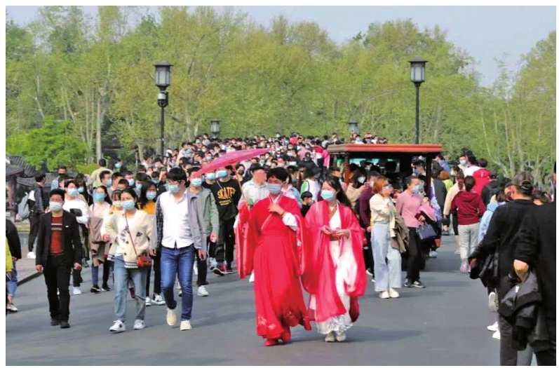 关于中等收入群体界定,目前国际上没有统一的标准。部分国际组织和国家对中等收入群体开展了一些研究,采用收入或消费的相对标准或绝对标准进行衡量,并测算部分国家的中等收入群体规模。经国内权威机构研究表明,中等收入家庭是指一定时期内收入稳定、家庭殷实、生活舒适、消费水平和生活方式与经济社会发展水平相适应的群体。根据全国住户调查测算,2019年我国中等收入家庭人口达到4亿多,是全世界规模最大的中等收入群体。图为浙江省杭州市西湖风景区游人如织。