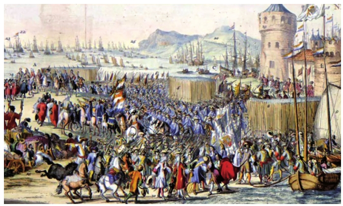 英国资产阶级革命,是一场以新贵族阶级为代表推翻封建专制统治建立起英国资本主义制度的社会革命,从1640年查理一世召开新议会开始,到1688年议会反对派发动宫廷政变(又称光荣革命)结束。这场革命推翻了封建统治,颁布了《权利法案》,以法律形式对王权进行明确制约,确立了君主立宪制。图为英国光荣革命。