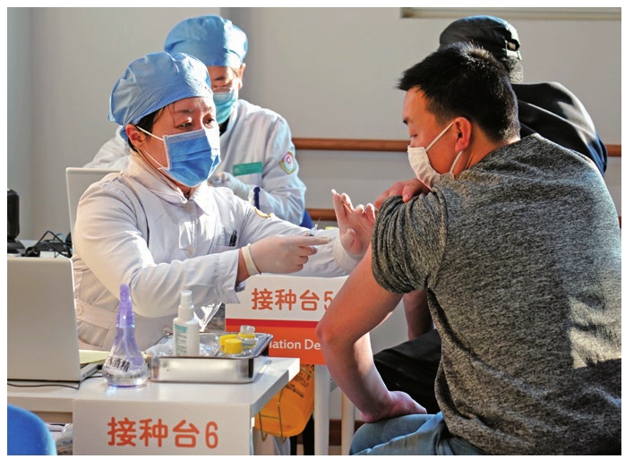 我国实行全民免费接种新冠肺炎疫苗。截至2021年6月初,我国累计接种疫苗超7亿剂次。图为北京市民接种新冠肺炎疫苗。