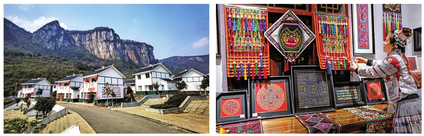 贵州省黔西县化屋村是一个拥有百年历史的苗族村寨,由于交通不便,加上石漠化严重,贫困发生率曾高达66.3%。党的十八大以来,在易地扶贫搬迁等惠民工程支持下,该村发生了翻天覆地的变化,告别贫困迎来小康。苗族同胞住上新居,创办民族刺绣扶贫车间,让搬迁群众搬得出、稳得住、能致富。图为化屋村易地扶贫搬迁集中安置点和扶贫车间生产的工艺品。