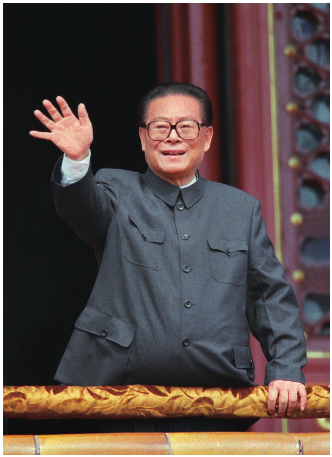 1999年10月1日,江泽民在天安门城楼上向参加庆祝中华人民共和国成立50周年大会的群众游行队伍挥手致意