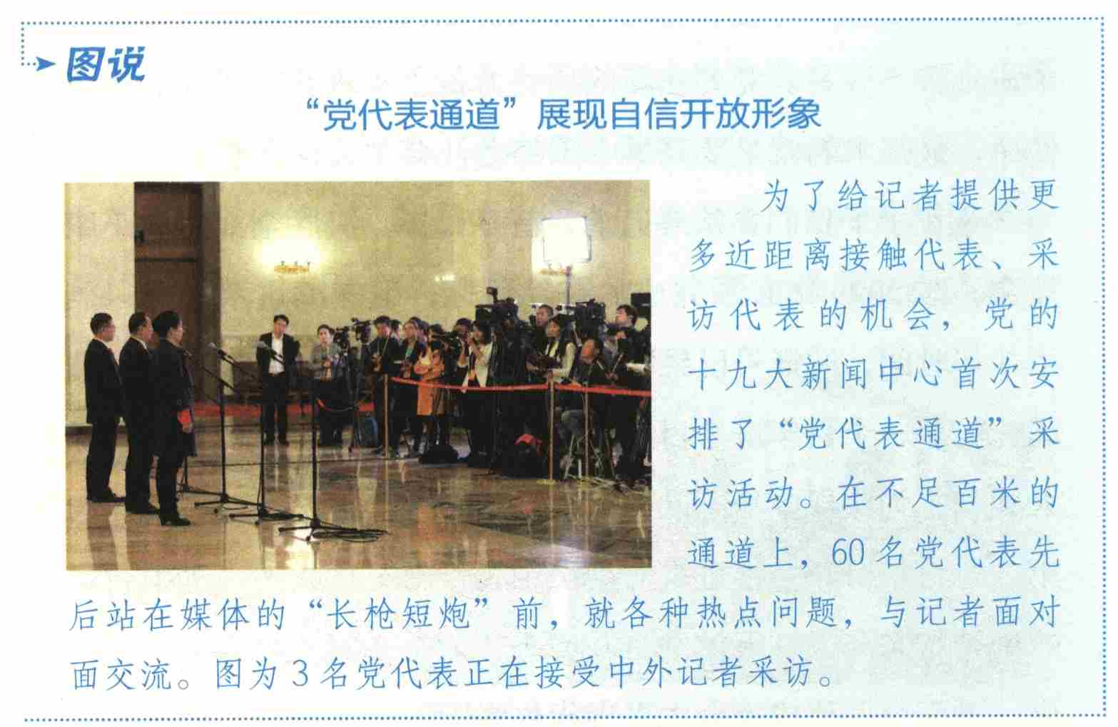 7天、5大议程;主席团会、全体大会、分组讨论会;6场记者招待会、8场集体采访、34个代表团开放日、“党代表通道”……党的十九大丰富充实的会议内容、紧张有序的会议安排、热烈充分的讨论酝酿、透明开放的自信姿态,亮点迭出、精彩纷呈,硕果累累、影响深远。