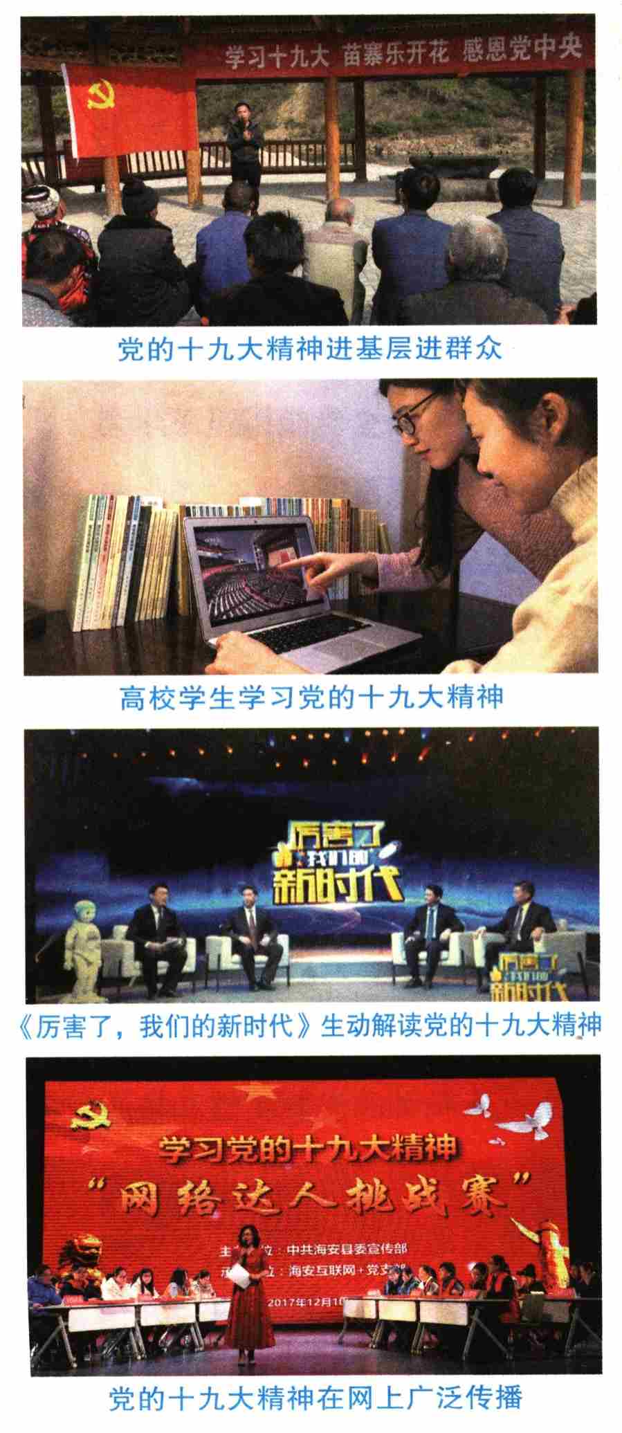 初冬寒意渐浓,神州热潮涌动。2017年11月,党的十九大刚刚闭幕,中央宣讲团就马不停蹄奔赴全国各地。在“中央级”宣讲的带动下,各地各部门结合各自实际,开展了形式多样的宣讲活动,推动党的十九大精神进基层进群众。在厂矿车间,在田间地头,在街道社区,在机关,在军营,在学校,各个层次、多种喜闻乐见的宣讲报告、互动交流活动,既严谨又生动,全党全国上下学习宣传贯彻党的十九大精神的高潮迅速兴起。