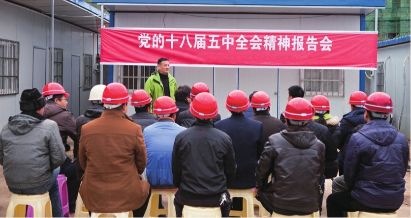 党的十八届五中全会后,各地组织形式多样的学习宣传活动,让全会精神深入人心。图为江西省景德镇市基层宣讲员在工地宣讲全会精神。