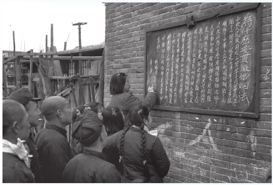 1950年4月13日,中央人民政府委员会第七次会议通过《中华人民共和国婚姻法》,并于同年5月1日公布施行。这是新中国成立后诞生的第一部具有基本法性质的重要法律。这部婚姻法充分体现了婚姻自由,为无数两情相悦的男女追求幸福生活、建立社会主义新型家庭关系提供了法律保证。图为当时北京市的基层干部在街头书写宣传婚姻法的黑板报。