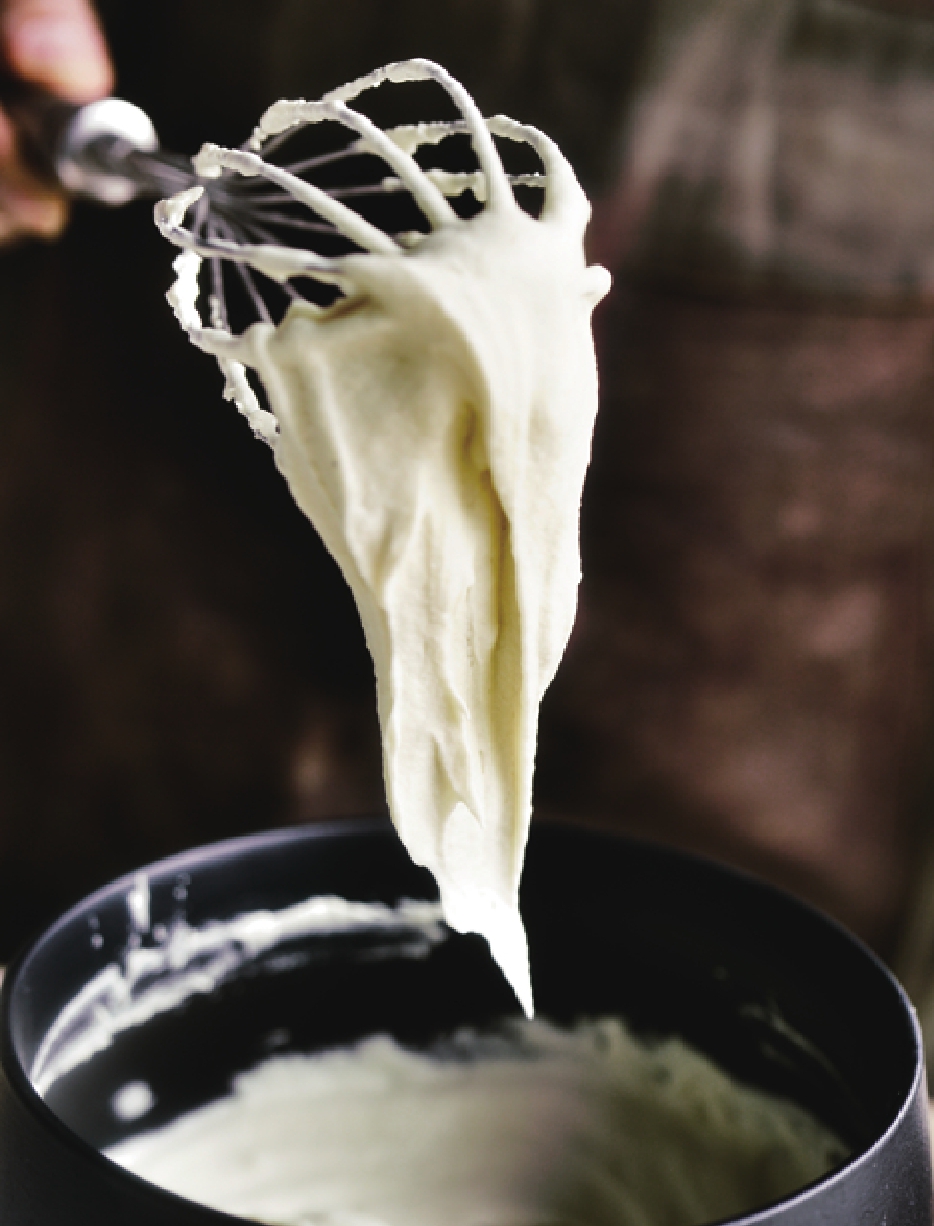 3.用喷雾水壶逐步加水搅拌至糨糊状,舀起一勺,欲滴未滴的,就刚好。可以借助手动或电动打蛋器搅拌。