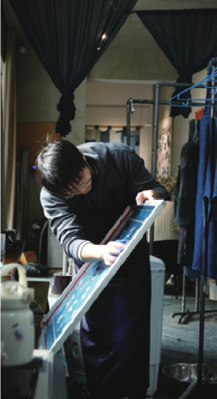 当时正好成都有个乐队叫“快乐的孩子爱歌唱”,手绘了乐队的标识,想要做一款有乐队标识的草木蓝染演出服。我就想先用型染的方法打个样。