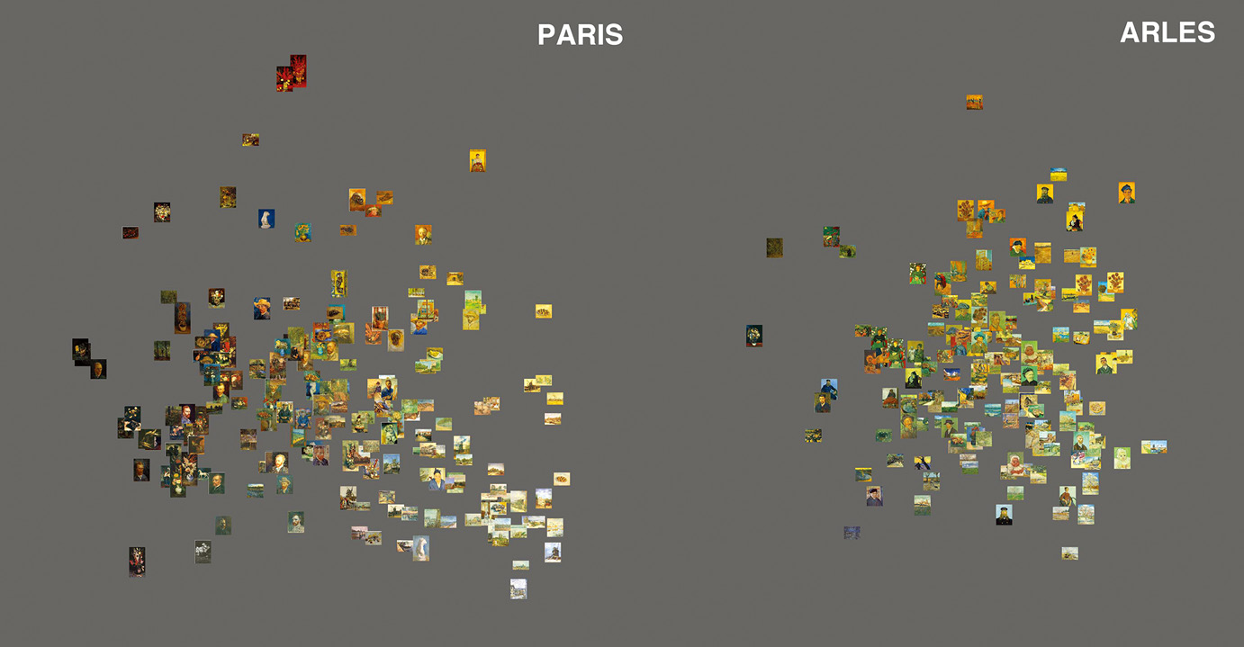 彩图8 根据中位数亮度(x轴)和中位数饱和度(y轴)对凡·高在阿尔勒和巴黎创作的作品进行比较。