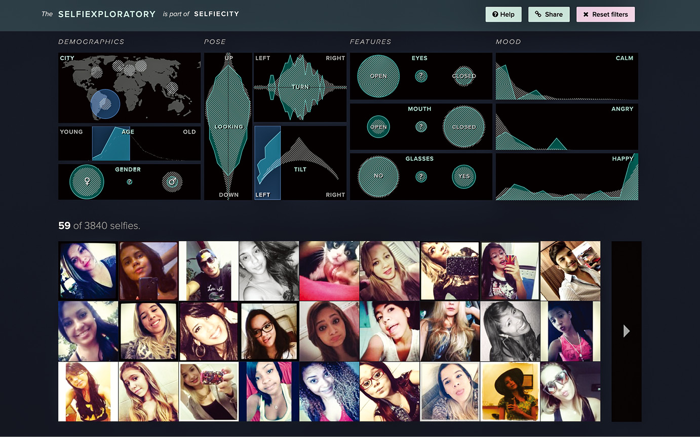 彩图5 “潮自拍”项目“自拍探索”程序的截图,2014年。作者:列夫·马诺维奇、莫里茨·斯特凡纳、丹尼尔·戈德迈尔、多米尼克斯·鲍尔、杰·周、艾丽斯·蒂芬塔尔、迈赫达德·亚兹达尼和纳达夫·霍赫曼。