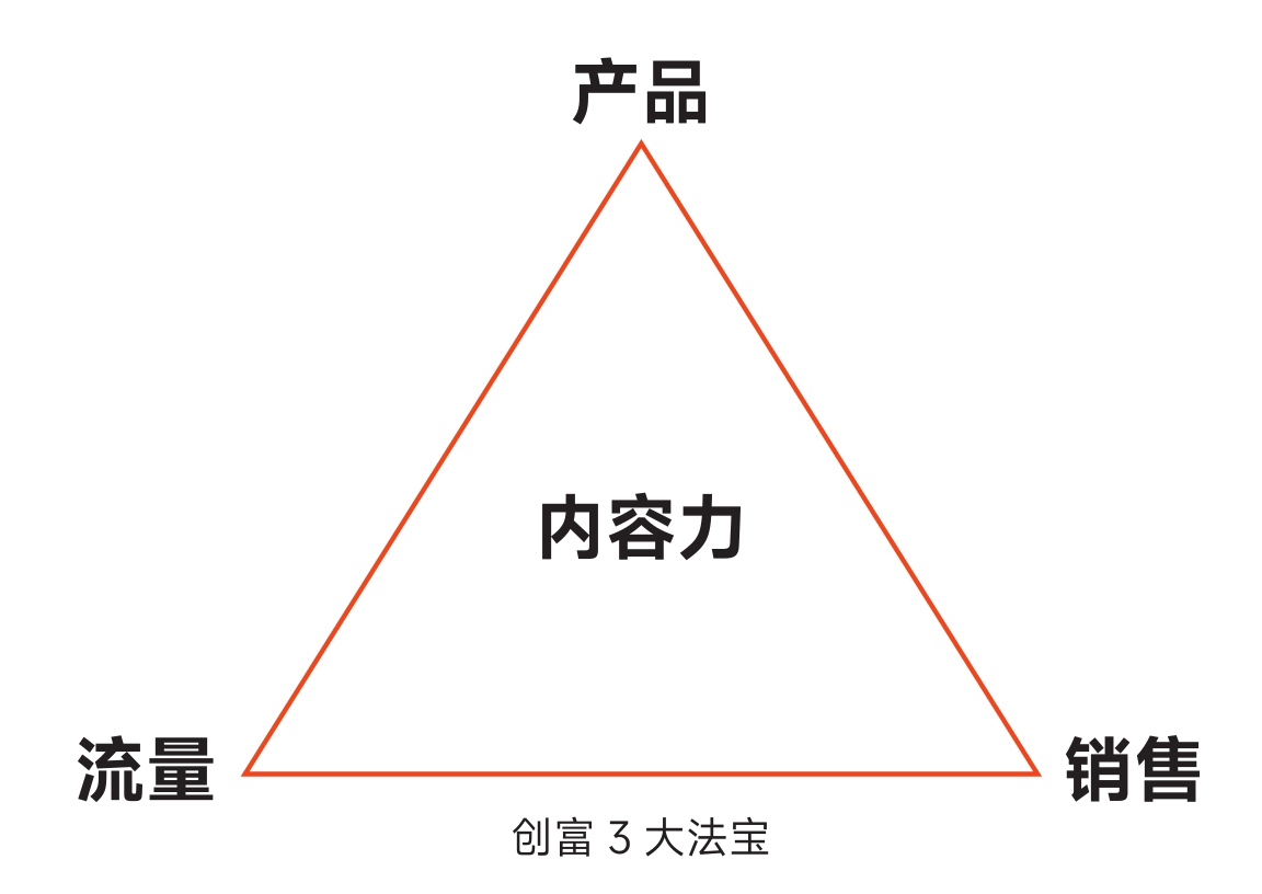 这就是我认为的最简洁的创业创富思维框架,即创富3大法宝:产品、流量和销售。