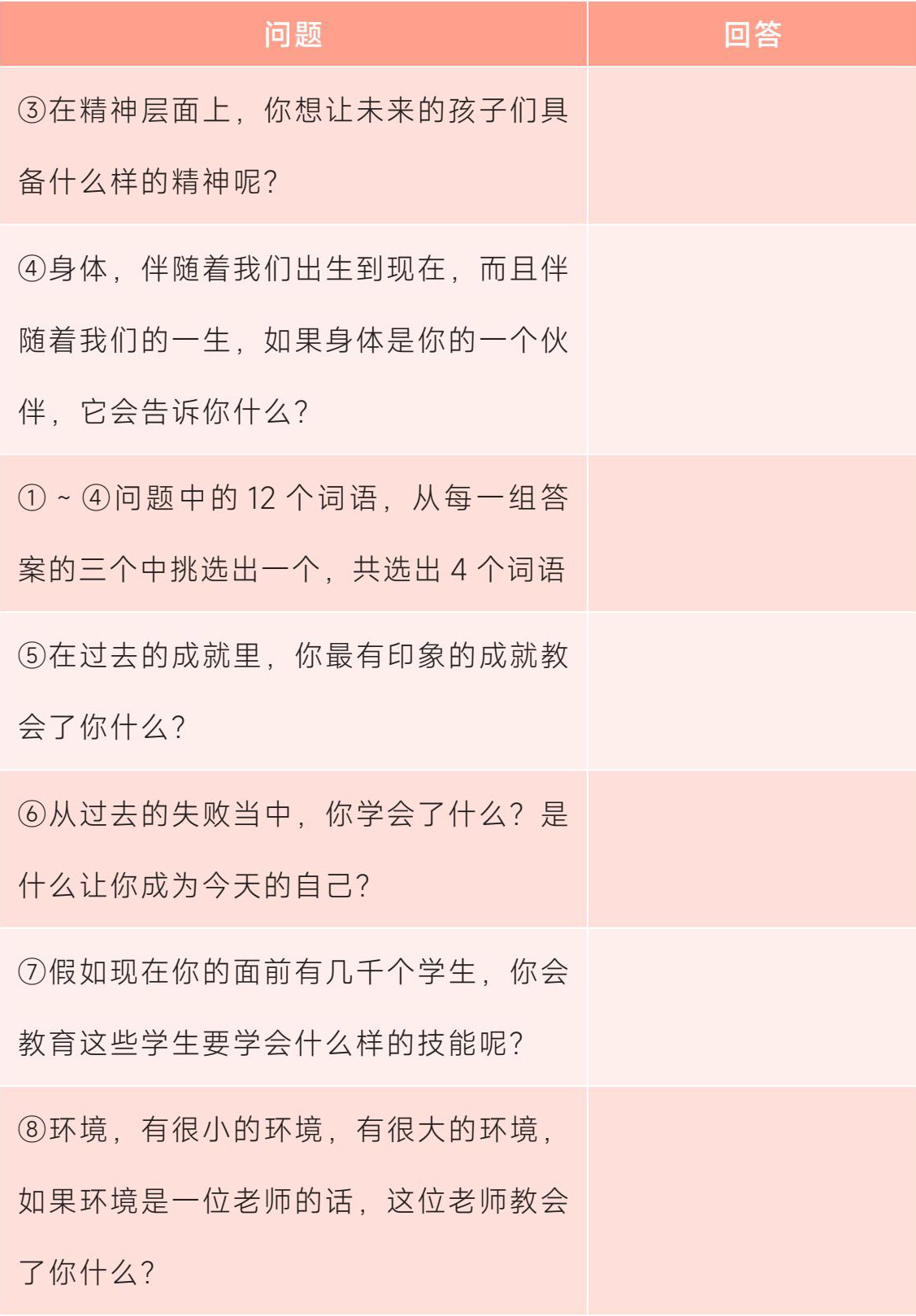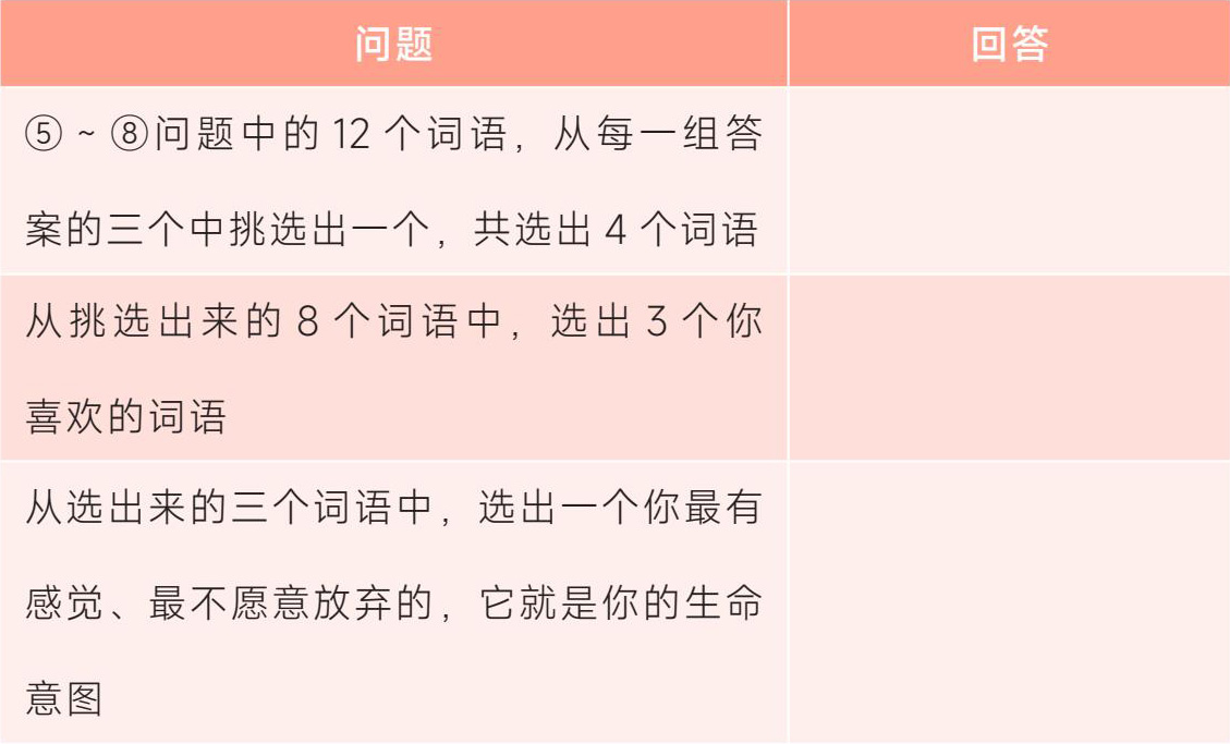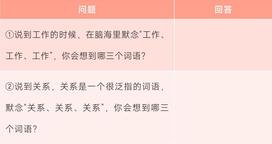 现在,请你准备好一张白纸、一支笔,找一个安静的空间、一段独处的时间,时间预计15分钟。当你看到问题时,凭借第一反应,脑子里最先冒出来的是什么词语,就记录下来。每个问题回答三个词,名词、动词、形容词均可。