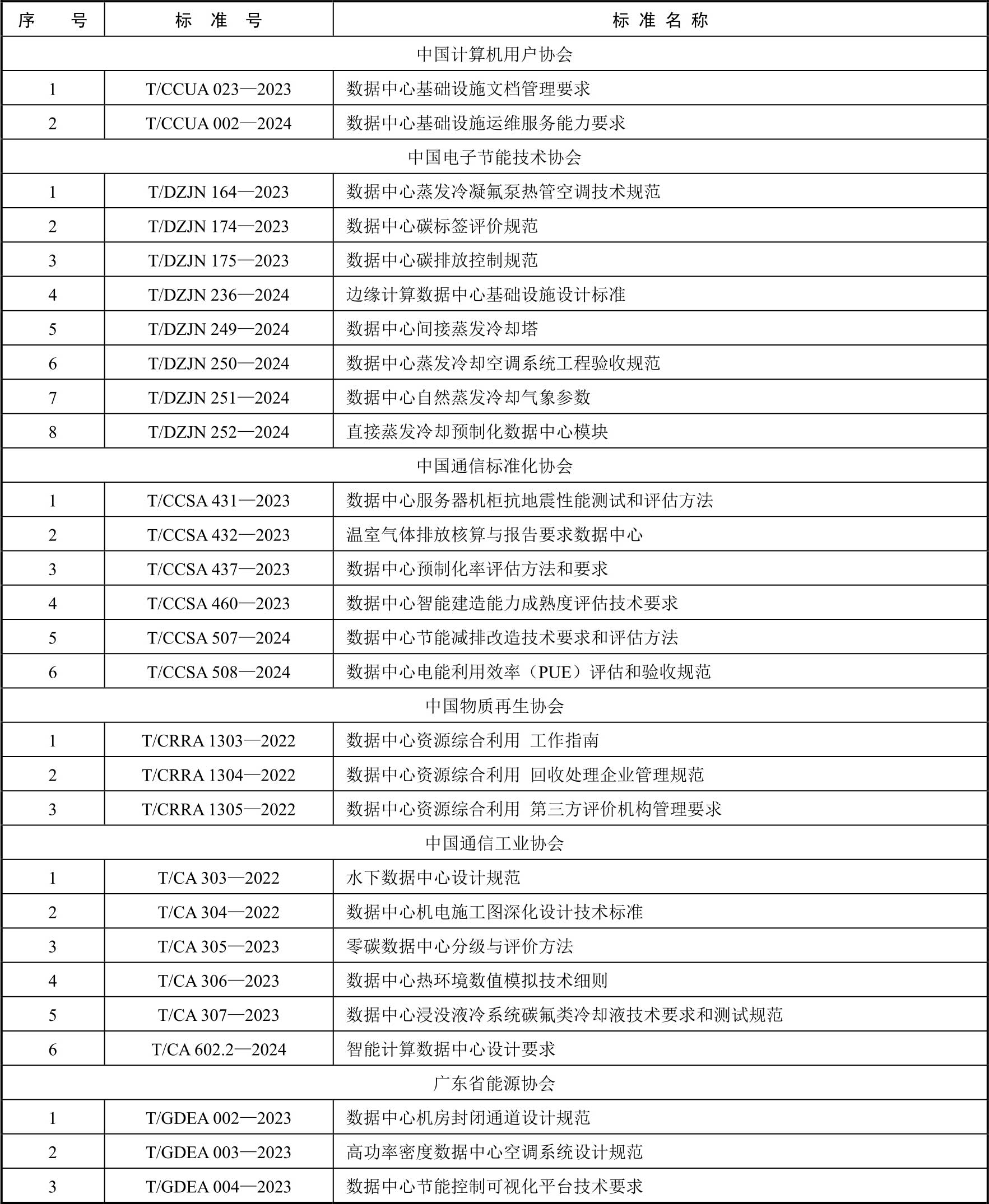 (6)T/CCSA 508—2024《数据中心电能利用效率(PUE)评估和验收规范》。该标准从数据中心设计阶段、运行阶段对电能利用效率技术、评估和验收要求进行了规范,适用于新建数据中心,改扩建数据中心参照执行,以及独立配电、空气冷却、电动空调的数据中心建筑单体或模块单元的设计、运行阶段电能利用效率评估和验收。