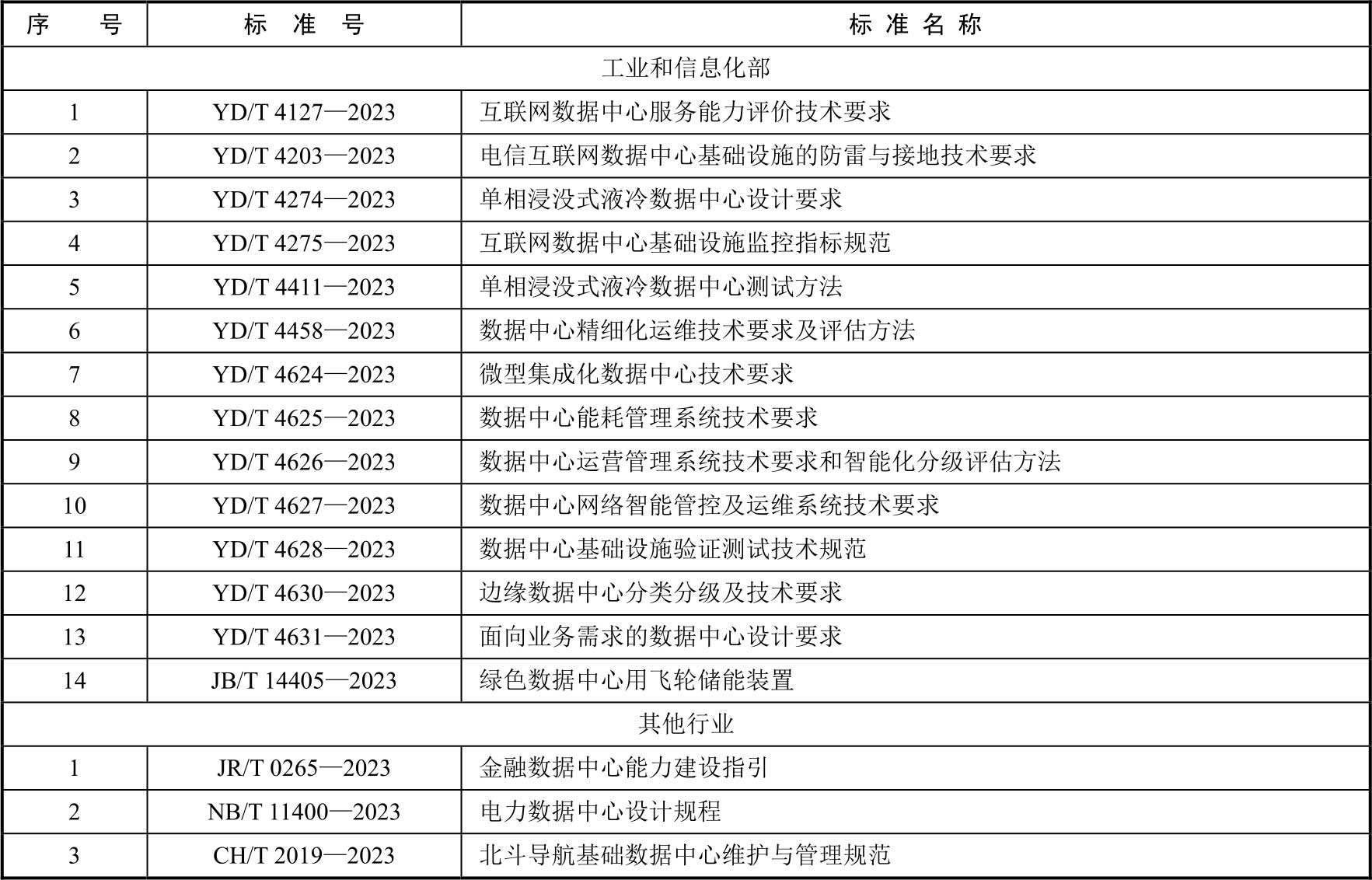 (13)YD/T 4631—2023《面向业务需求的数据中心设计要求》。该标准规定了面向业务需求的数据中心建设和升级改造等方面的设计要求,适用于指导云数据中心、智能计算中心、边缘数据中心及金融等特殊领域数据中心的建设及升级改造工作。