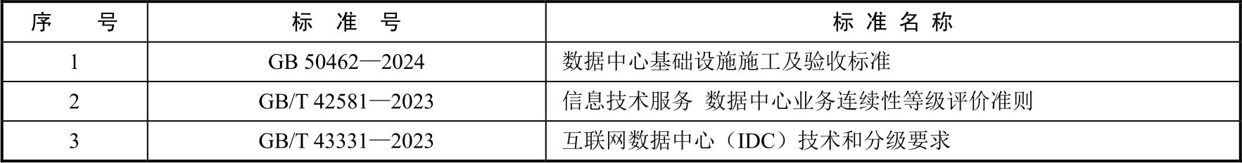 (1)GB 50462—2024《数据中心基础设施施工及验收标准》。该标准总结了近年来数据中心安装工程在设计、材料、设备、施工等方面的实践经验,按照过程控制强化验收的原则,参考有关国际标准和国外先进标准,并在广泛征求意见的基础上进行修订。其目的是加强数据中心基础设施工程管理、规范施工及验收要求,保证工程质量。该标准适用于新建、改建和扩建的数据中心基础设施施工及验收。