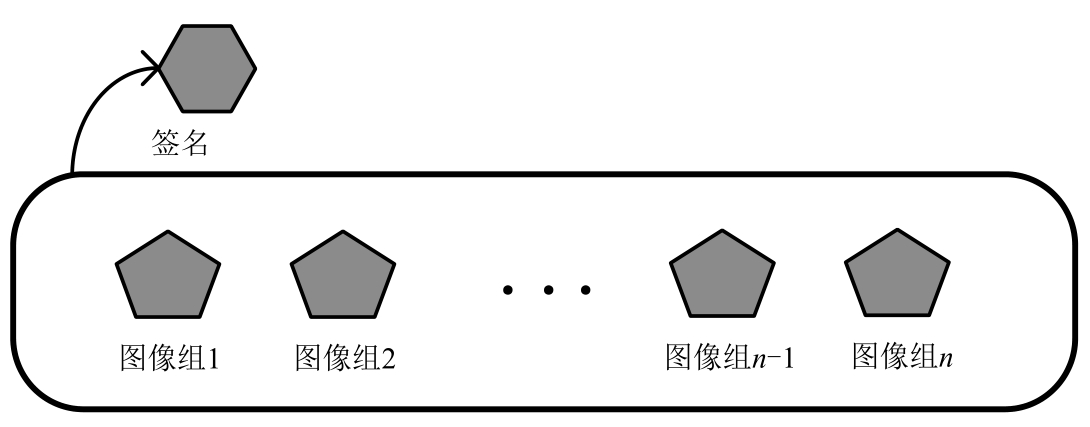 图像组的哈希值签名是将多个图像组的哈希值连接起来同时进行签名。签名算法(如RSA Signature方法)较哈希算法(如SHA-1)需要更长的计算时间、更多比特数表示结果,若对每个图像组单独进行签名,则将花费较长的计算时间,造成较大的认证负载,而对多个图像组共同进行签名(见图2-10),可以节省一定的通信带宽和签名算法计算时间,但接收端此时需要同时获得 n 个图像组数据单元才能进行认证,这在一定程度上增加了接收端的延迟时间。实验中可通过仿真选择合适的图像组数据单元数量,用于多个图像组的签名认证。