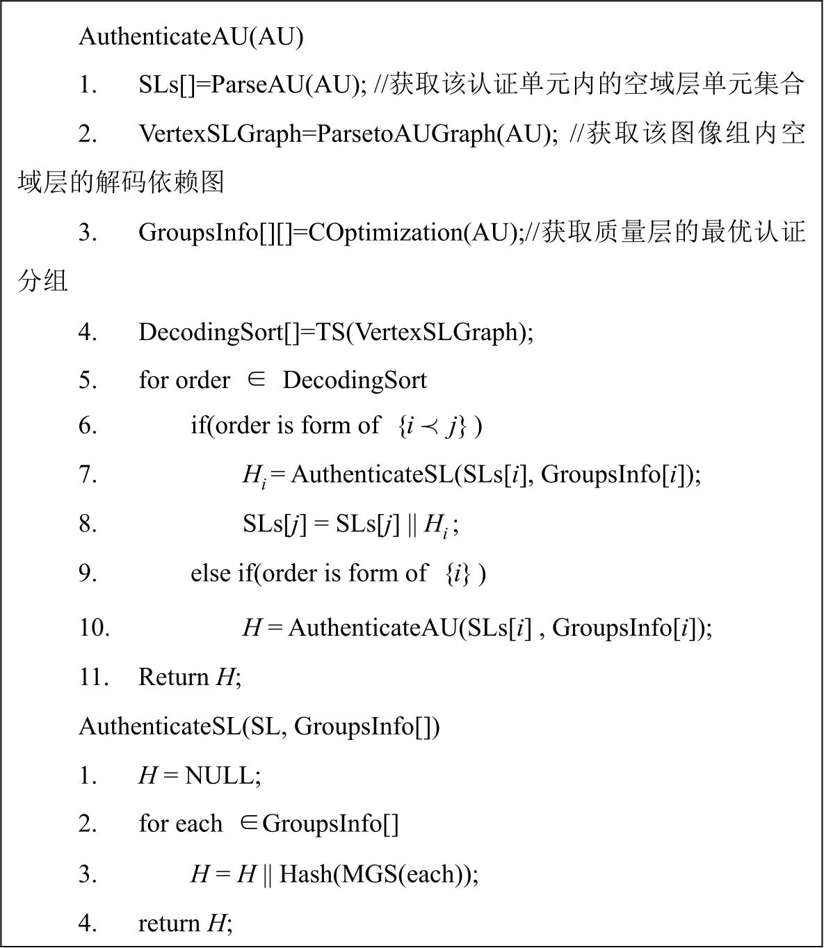图2-12所示为AuthenticateGOP认证框架,其对图像组进行认证时,首先通过拓扑排序获得视频帧之间的认证关系(见AuthenticateGOP认证框架第3行);然后循环地从拓扑排序集合中读取认证关系,依次对时域视频帧进行认证(见AuthenticateGOP认证框架第4~10行)。图2-13中也采用类似方法实现视频质量层数据之间的认证。