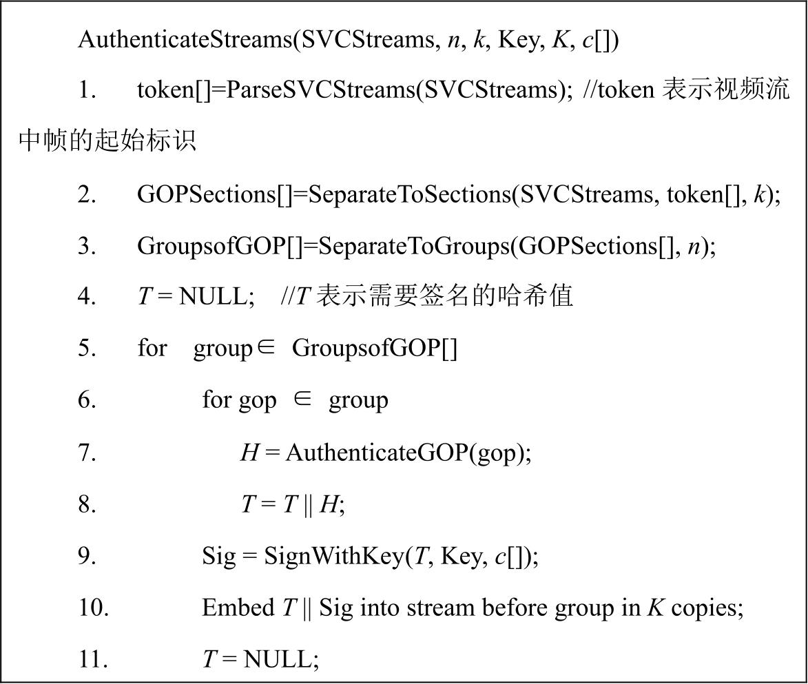 基于解码关系图拓扑排序的视频流认证框架如图2-11~图2-13所示。图2-11所示为AuthenticateStreams认证框架,其对视频流进行认证,参数 k 表示图像组中的时域帧数目, n 表示同时签名的图像组数目,Key表示认证方签名的私钥, c []表示认证方需要额外添加的认证信息,如视频可信内容标引中的高层语义信息。认证时,首先对SVCStreams流进行解析,获得视频帧的起始标识(见AuthenticateStreams认证框架第1行);然后对视频帧进行图像组划分(见AuthenticateStreams认证框架第2~3行),按照给定参数 n 对图像组进行分组,并分别认证签名;最后将签名数据包封装成NAL数据包格式,并且重复 K 次嵌入流当前图像组分组的开始位置(见AuthenticateStreams认证框架第4~11行)。