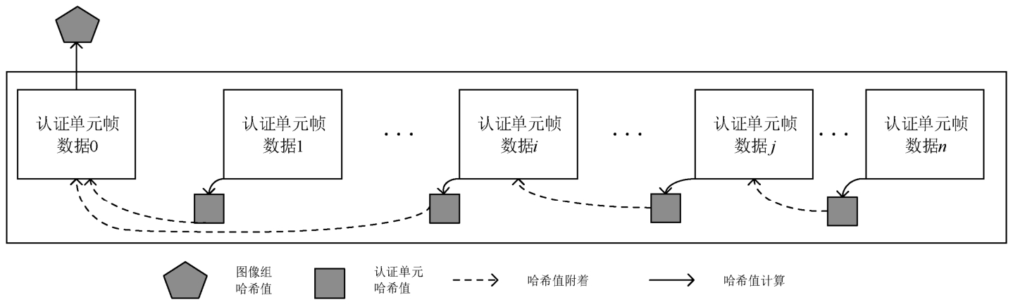 图2-9展示了图像组中视频帧之间的认证过程,首先按照解码关系图拓扑排序认证算法建立帧之间的哈希值附着方法;然后对解码关系图拓扑排序认证算法中依次出栈的顶点序列进行视频单元帧认证,如获得第 n 帧的哈希值 H n 后,将该哈希值附着在第 j 帧质量域的基础层MGS 0 数据之后。按照此方式进行哈希认证,最终将获得该图像组的哈希值(GOP Hash),之后对其进行签名认证。在图2-8和图2-9中,实线箭头表示对视频逻辑单元数据进行哈希值计算以获得相应的哈希值,而虚线箭头则表示哈希值附着。