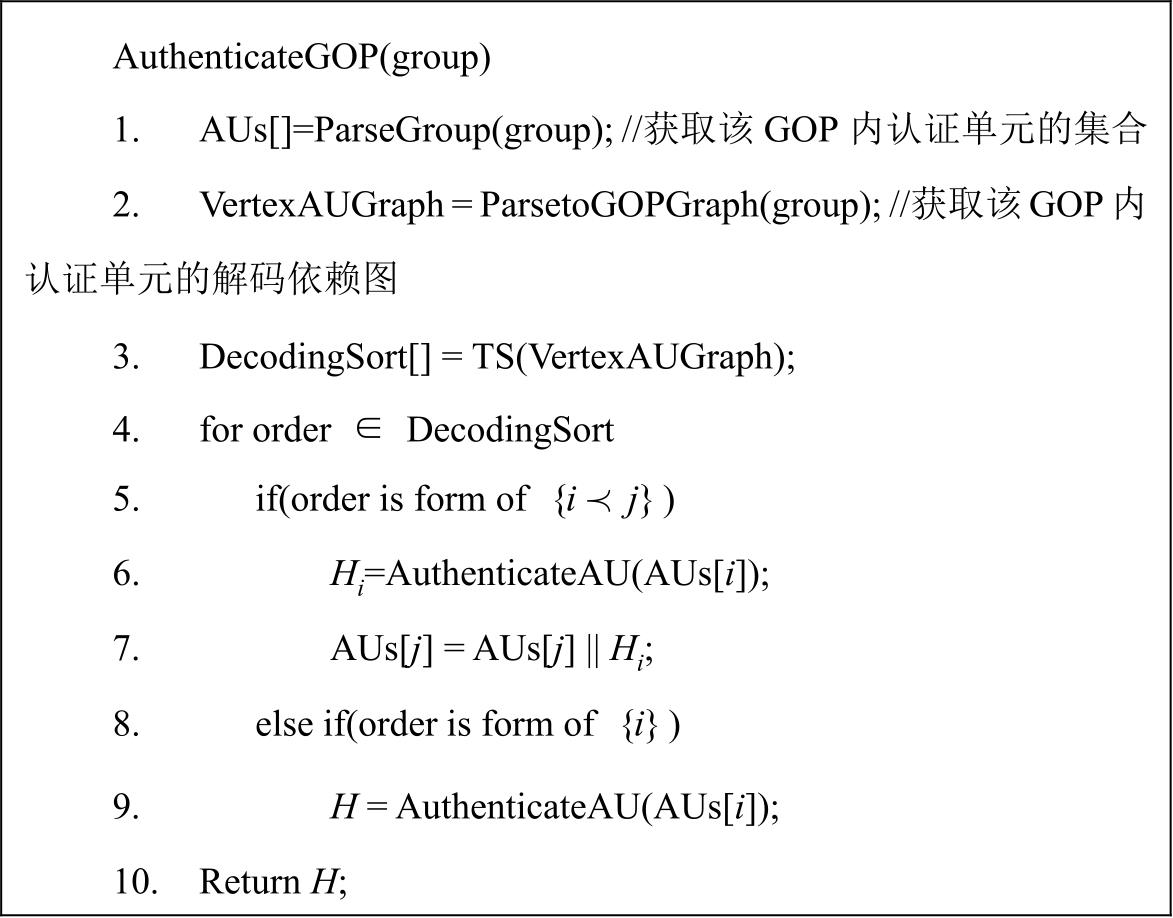图2-12所示为AuthenticateGOP认证框架,其对图像组进行认证时,首先通过拓扑排序获得视频帧之间的认证关系(见AuthenticateGOP认证框架第3行);然后循环地从拓扑排序集合中读取认证关系,依次对时域视频帧进行认证(见AuthenticateGOP认证框架第4~10行)。图2-13中也采用类似方法实现视频质量层数据之间的认证。