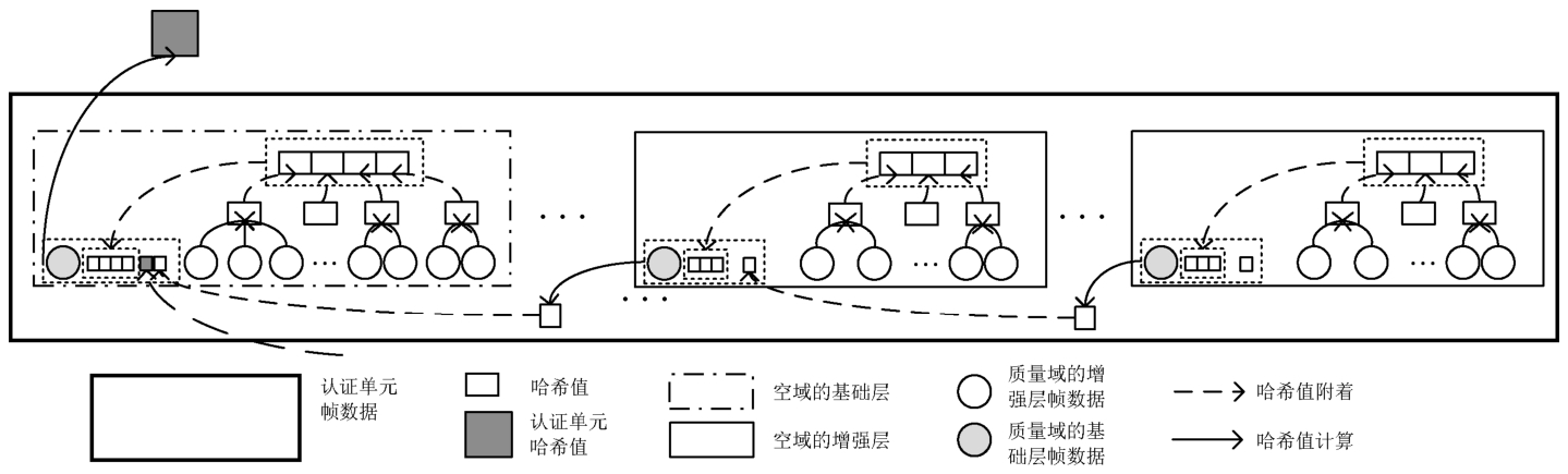 对于空域或质量域,其安全认证过程与图像组中帧的安全认证过程类似。对于质量域,虽然对其采用了分组认证方法,但该分组认证的哈希值将连接起来附着在质量域基础层中,因此所有子信道将获得这些哈希值,即使某些信道由于网络带宽限制丢弃了一些较高层的质量层数据。若某些较高层的空域或质量域数据被恶意修改,则经过重新计算的哈希值将与附着在质量域基础层的哈希值有所不同,故接收端通过认证将发现这些安全问题。