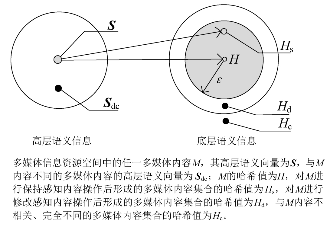 图1-1中,高层语义空间 S = S ∪ S dc ; S dc 表示与 M 不同的多媒体内容(包括修改感知内容和内容不相关的多媒体内容)的高层语义信息。多媒体内容集合 M s 的哈希值与 M 的哈希值之间的关系为