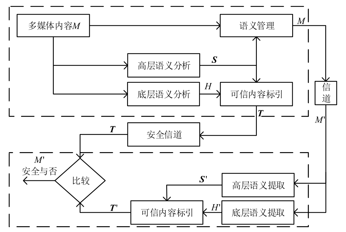 在采用可信内容标引实现多媒体信息可信认证时,其步骤主要包括发送端多媒体内容语义分析及管理、接收端语义提取与安全比较。基于可信内容标引的网络多媒体信息可信认证模型如图1-2所示。