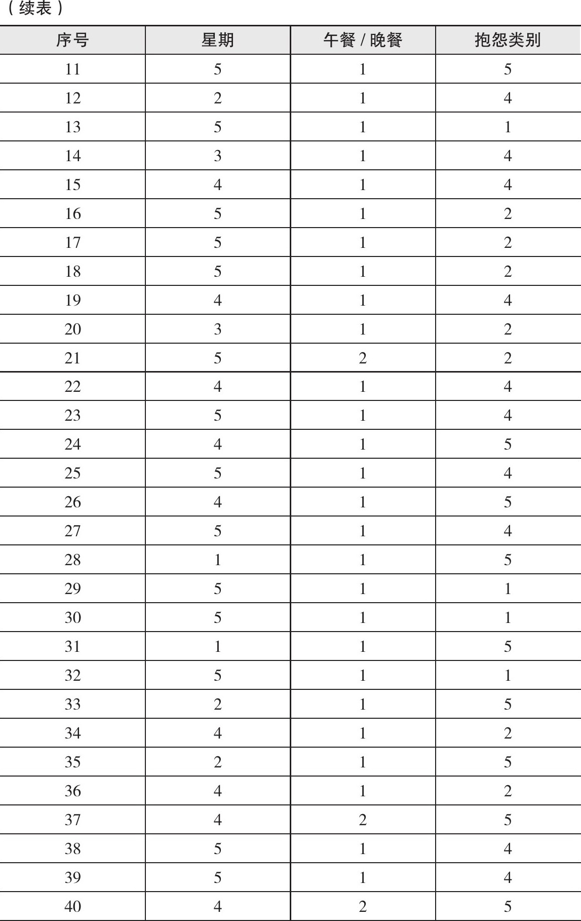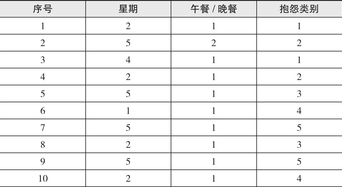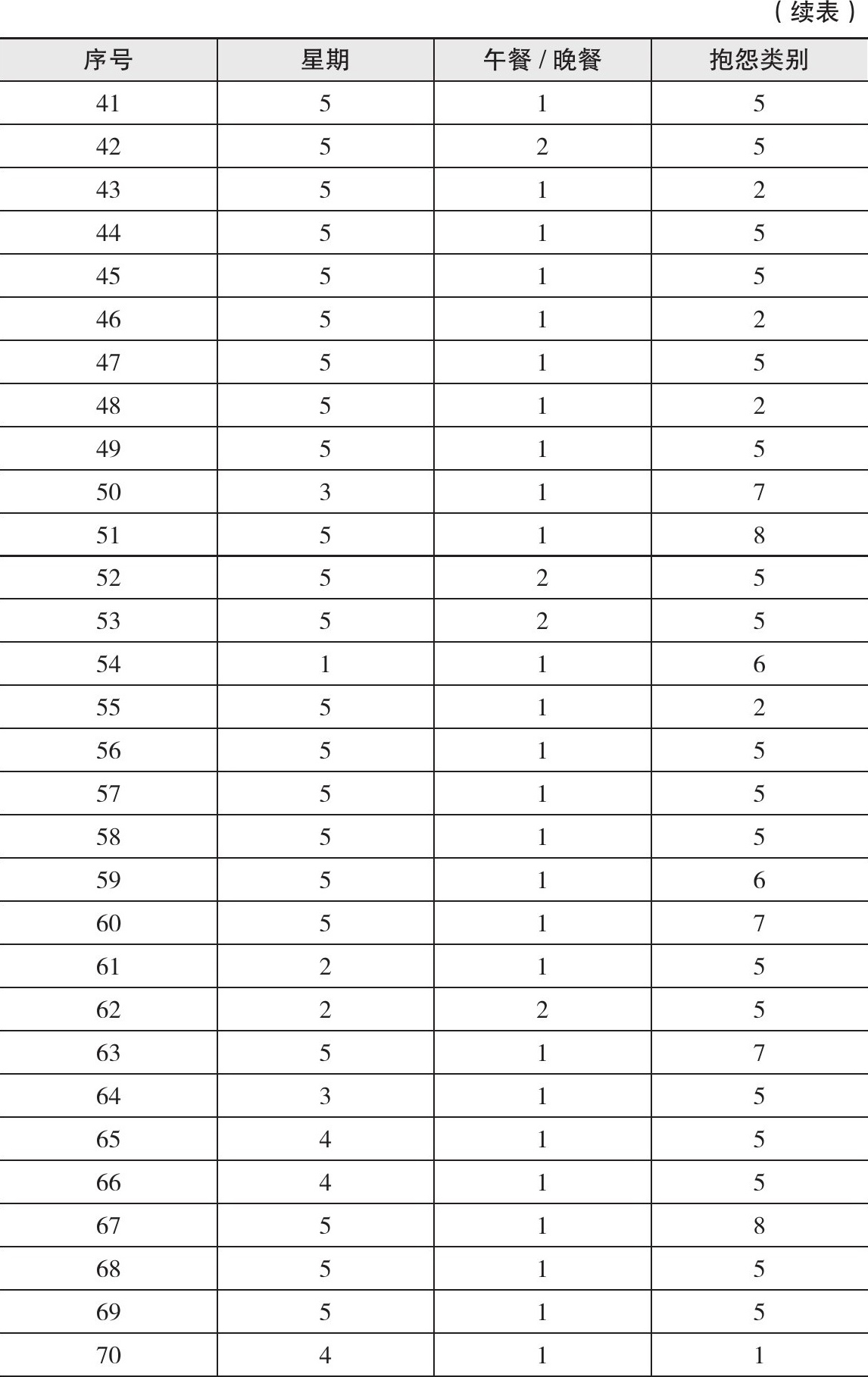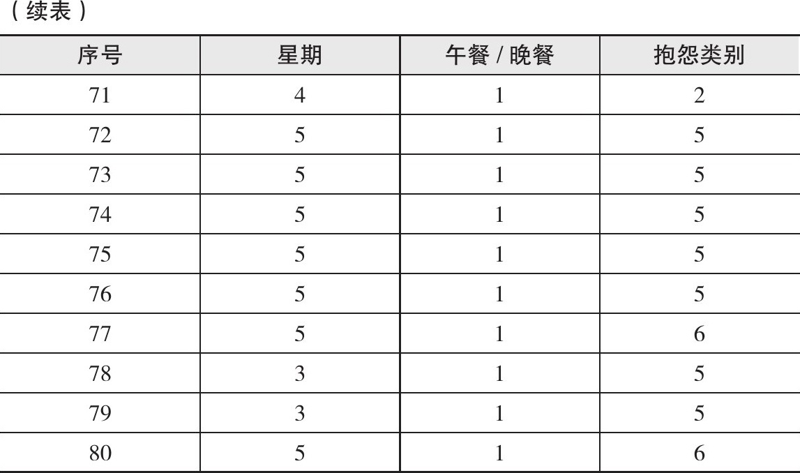 “抱怨类别”这列:1=服务生不礼貌;2=上错菜;3=环境不够好;4=食物太凉;5=等待时间太长;6=饭店太拥挤;7=食物不新鲜;8=其他。