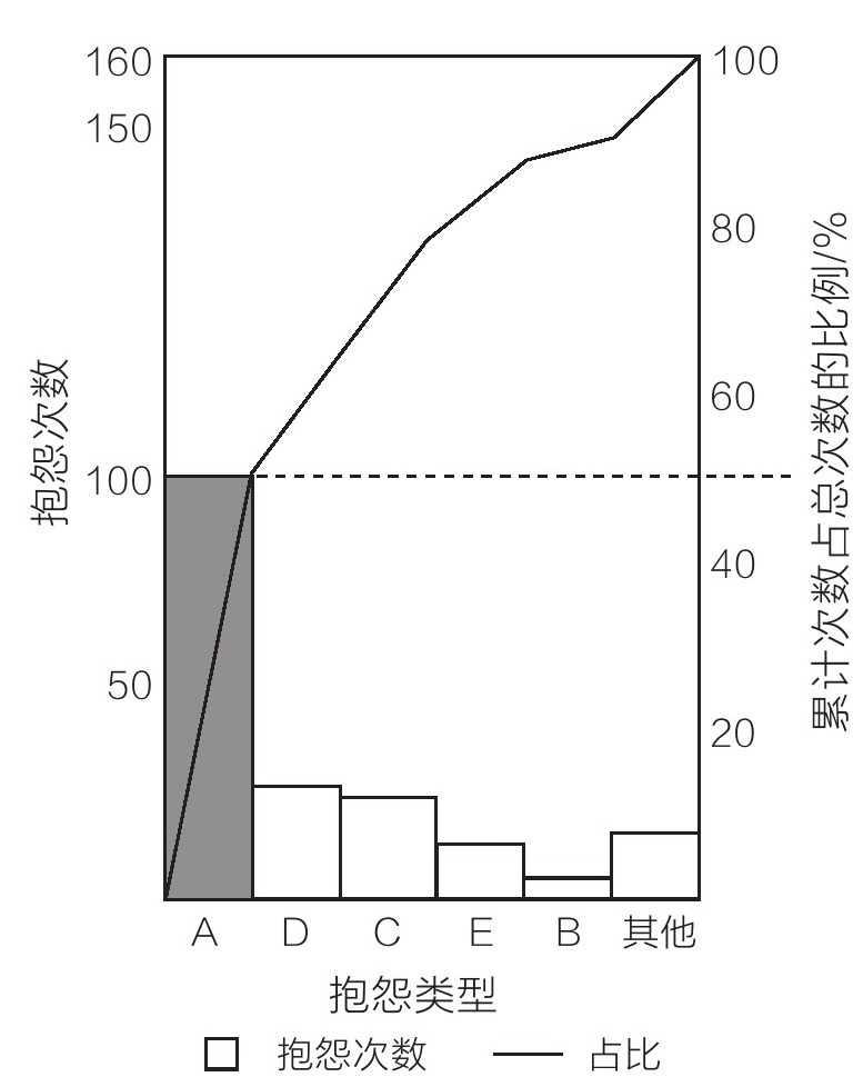 如图2-7所示,横轴是抱怨类型,左侧纵轴是抱怨次数,柱状图从高到低排列,“其他”项放最后。右侧纵轴是抱怨次数累计所占的百分比,即从左往右不断累加各抱怨类型的次数,所得的和占总次数的百分比,且这个百分比最后一定会是100%。