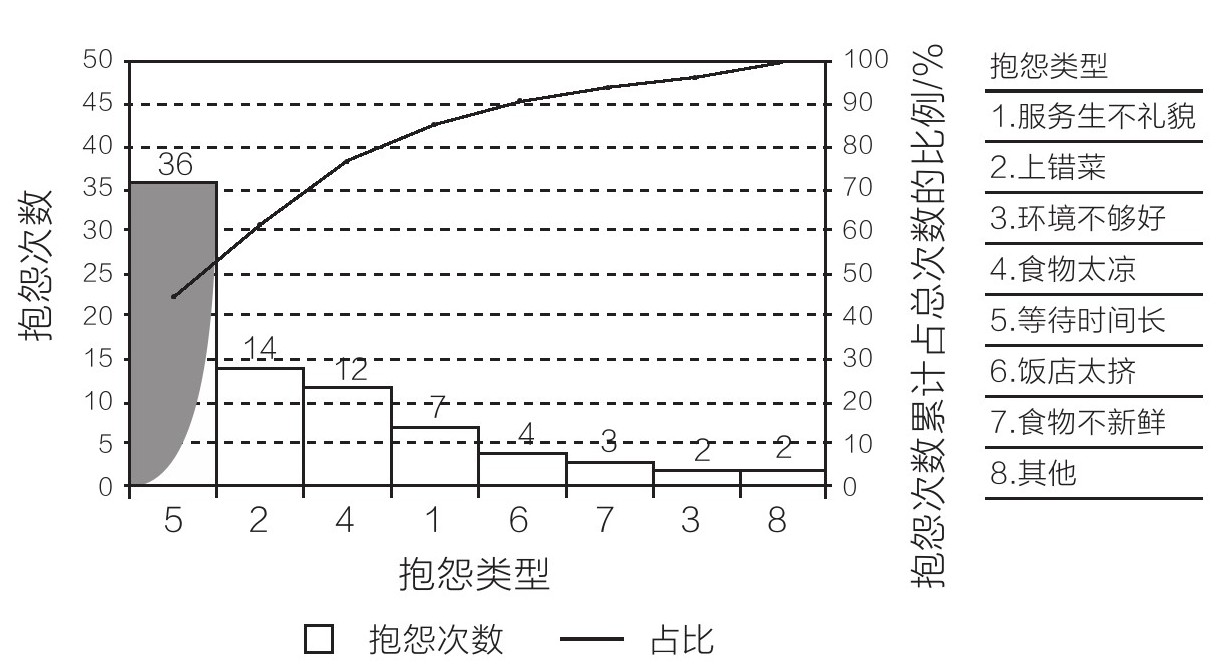 山姆一边思考一边自言自语起来:“等待时间太长是主要问题,占抱怨总数的45%左右。如果我们希望明显地降低抱怨,比如降低60%,那么就得解决两个主要问题,分别是等待时间太长和上错菜。”