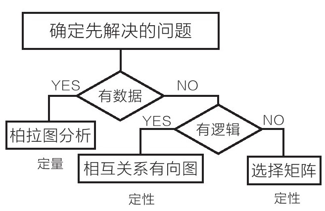 这时,有哪些方法可以帮助我们遴选出主要问题呢?如图2-3所示,如果工作中有数据且数据是真实准确的,我们建议使用柏拉图分析;如果缺乏与问题相关的数据,但问题群里的问题是有相互影响的关联逻辑的,我们建议使用相互关系有向图,即ID图分析;如果没数据且问题之间也无相互影响的逻辑关系,则可以考虑使用选择矩阵来分析。这就是所谓的见招拆招。