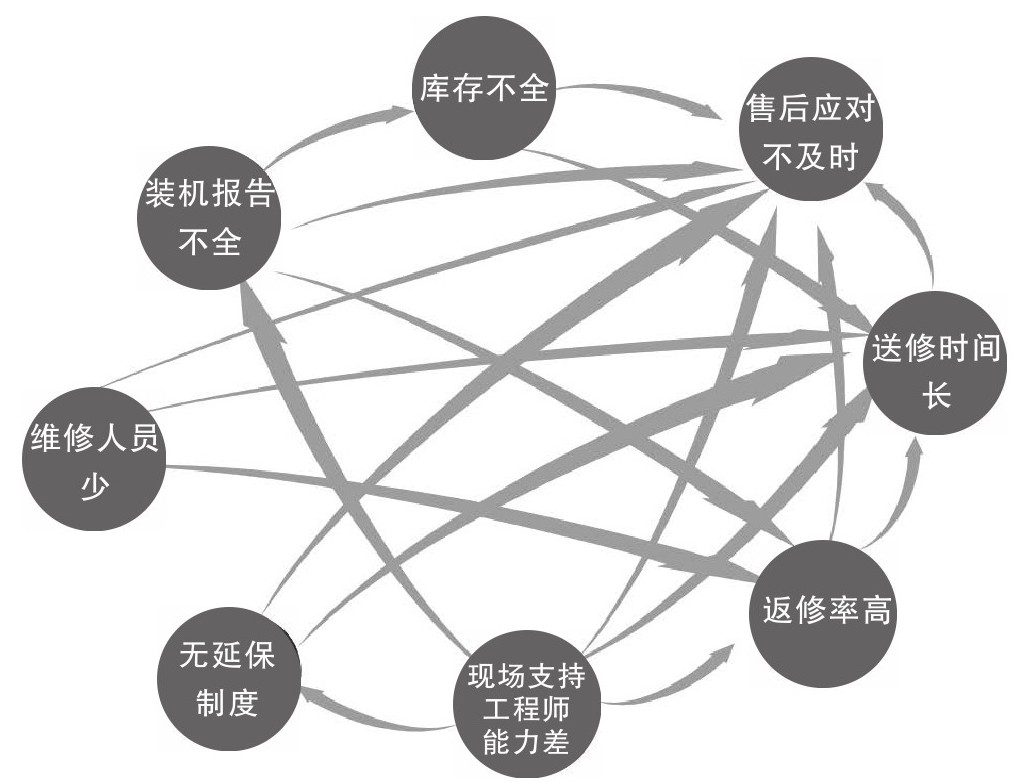 之后,我们分析所列问题之间的两两关系。例如,是“送修时间长”的问题导致或影响到了“售后应对不及时”的问题,那么箭头是从“送修时间长”指向“售后应对不及时”。