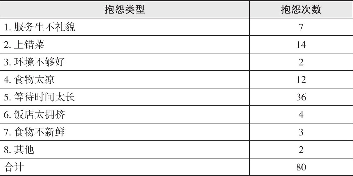 “抱怨类别”这列:1=服务生不礼貌;2=上错菜;3=环境不够好;4=食物太凉;5=等待时间太长;6=饭店太拥挤;7=食物不新鲜;8=其他。