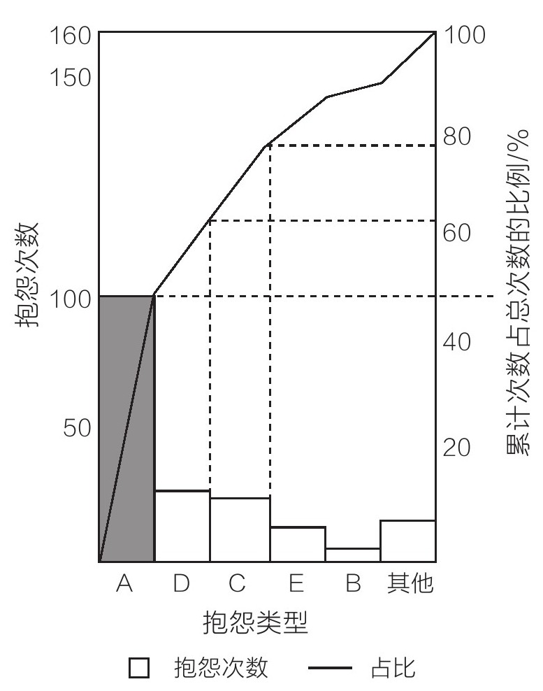 如图2-7所示,横轴是抱怨类型,左侧纵轴是抱怨次数,柱状图从高到低排列,“其他”项放最后。右侧纵轴是抱怨次数累计所占的百分比,即从左往右不断累加各抱怨类型的次数,所得的和占总次数的百分比,且这个百分比最后一定会是100%。