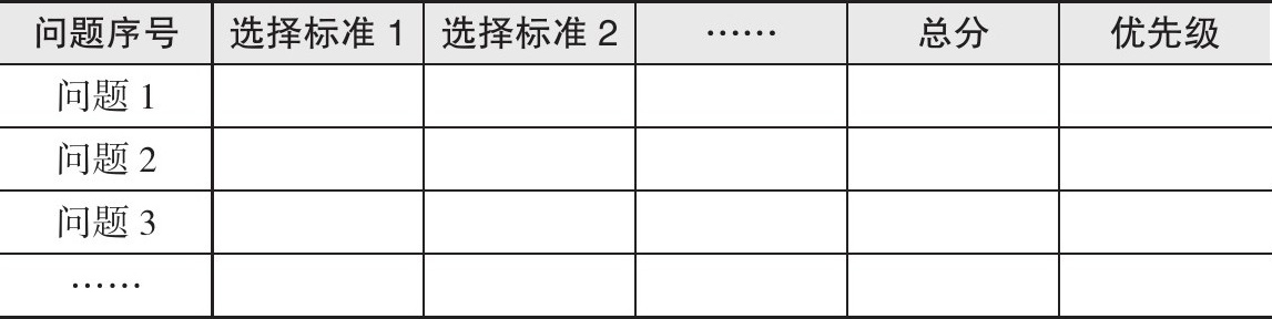 当然,选择标准不限于以上所列内容。一般在使用选择矩阵时,选择标准以3个至6个为宜,列在矩阵的横行,而在选择矩阵的纵列上排列的就是问题群里的各个问题,如表2-3所示。