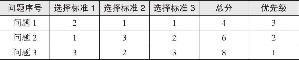 可能有读者会思考是否需要给选择标准匹配对应的权重。如果在考虑每个选择标准下哪个问题优先时是基于感性的判断而不是客观数据,此时的选择矩阵分析的本质是定性分析方法。在定性分析时,本书不推荐给每个选择标准匹配权重值,因为权重的引入不会提高选择矩阵的精度。此时选择矩阵的分析精度是由考虑每个选择标准下哪个问题优先时的感性判断决定的!