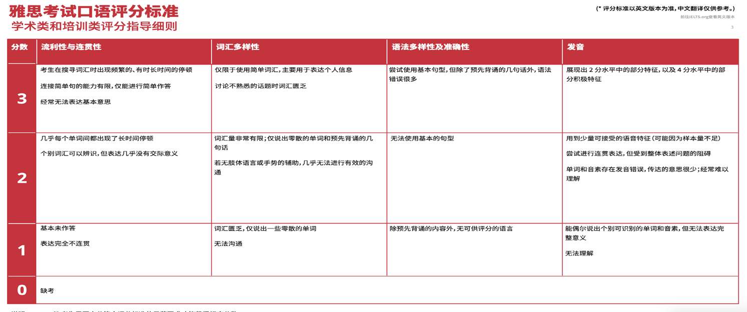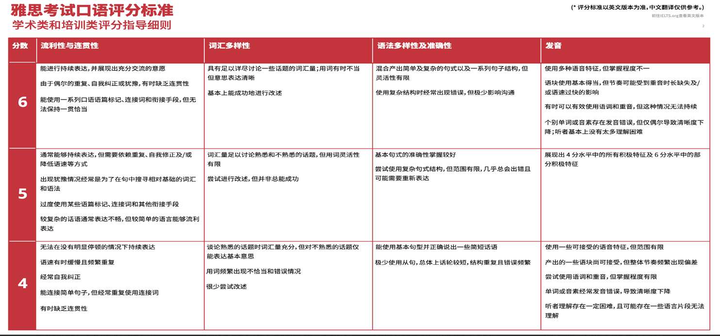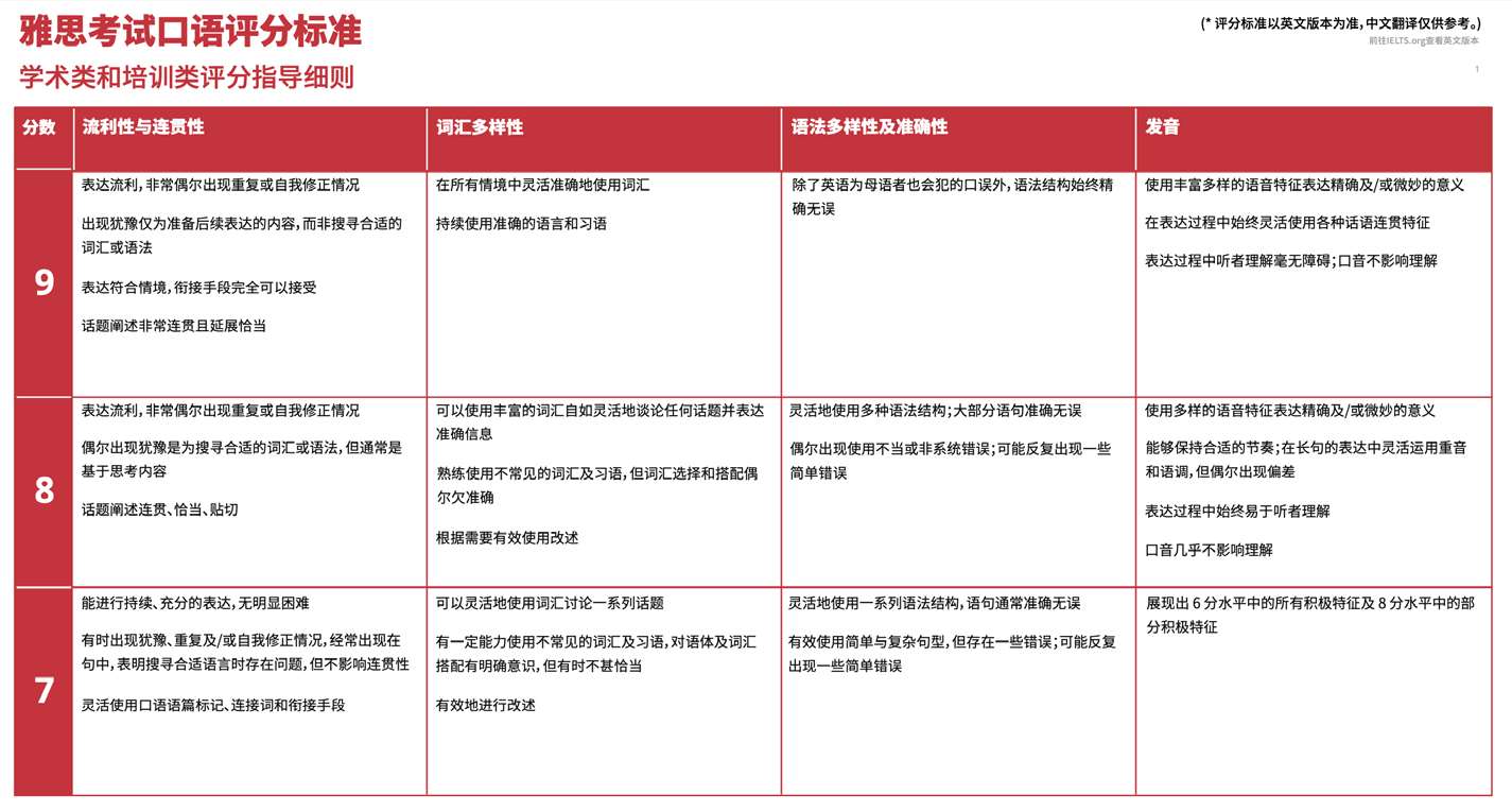 口语部分可以通过以下方法提升:提高发音准确性,关注连读、弱读和重读,提高语法多样性和准确性;提高流利度和连贯性,通过录音练习避免停顿,添加细节以丰富回答;扩展回答内容,鼓励多说话,避免简短回答结束对话。同时,考生应注意抛弃中式思维,直接表达观点后再进行论证和总结,打造个性化模板,发展适合自己的表达方式,避免机械背诵,并训练表情和肢体语言,通过自信的眼神和表情传达情感。具体雅思口语官方评分标准见下图。