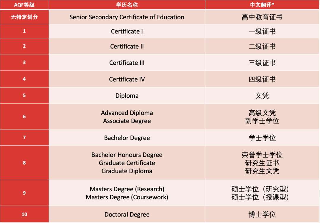 澳大利亚有43所大学和300多所专科技术学院。澳洲教育质量框架Australian Qualifications Framework(AQF)共包含10个等级。由1至10逐级增高。如下表。