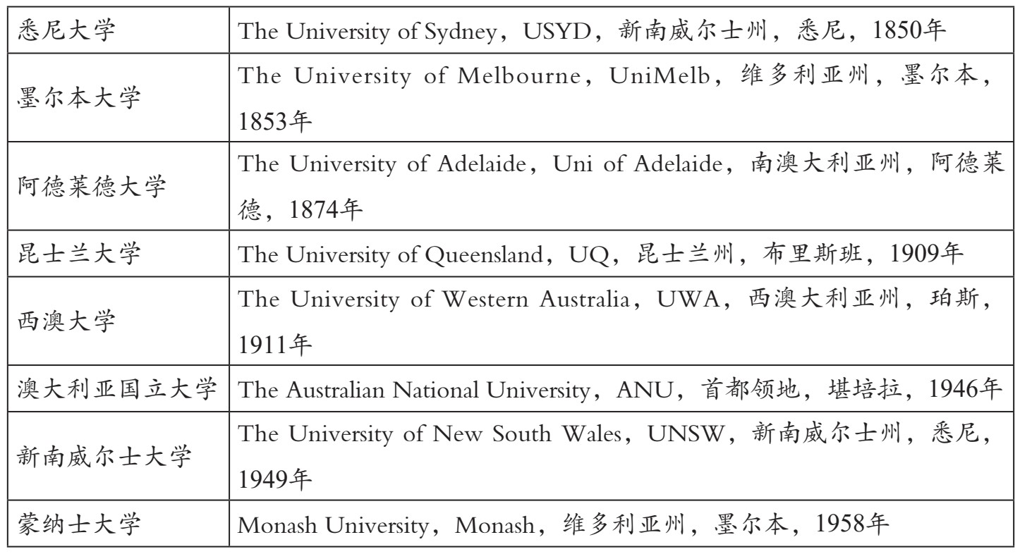 澳大利亚八校联盟(Group of Eight,简称Go8或G8),又称澳大利亚八大名校、澳大利亚八校集团,是澳大利亚著名的高校联盟。该联盟成员是澳大利亚享誉国际的八所顶尖综合研究型大学,如下: