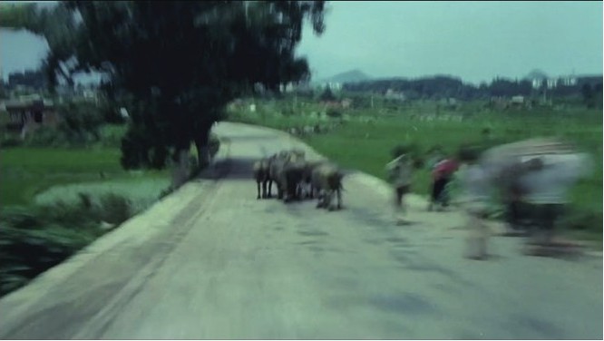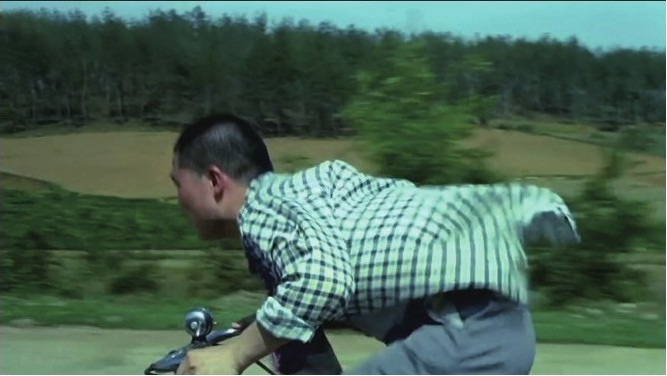 电影《寻枪》中,也出现了很多主观镜头,在马山抓小偷和骑车跟踪这两段情节中都有主观镜头的运用。抓小偷这段因为是追逐戏,节奏较快,如图2-3-13至图2-3-18所示,其中2-3-13是客观镜头,接着转成小偷的主观镜头。在跟踪这段情节中,节奏相对要缓和,但是为了渲染跟踪的紧张、追寻的氛围,采用了主观镜头与客观镜头切换的形式,同时把主观镜头都处理成自然晃动的画面效果,如图2-3-19至图2-3-24所示。