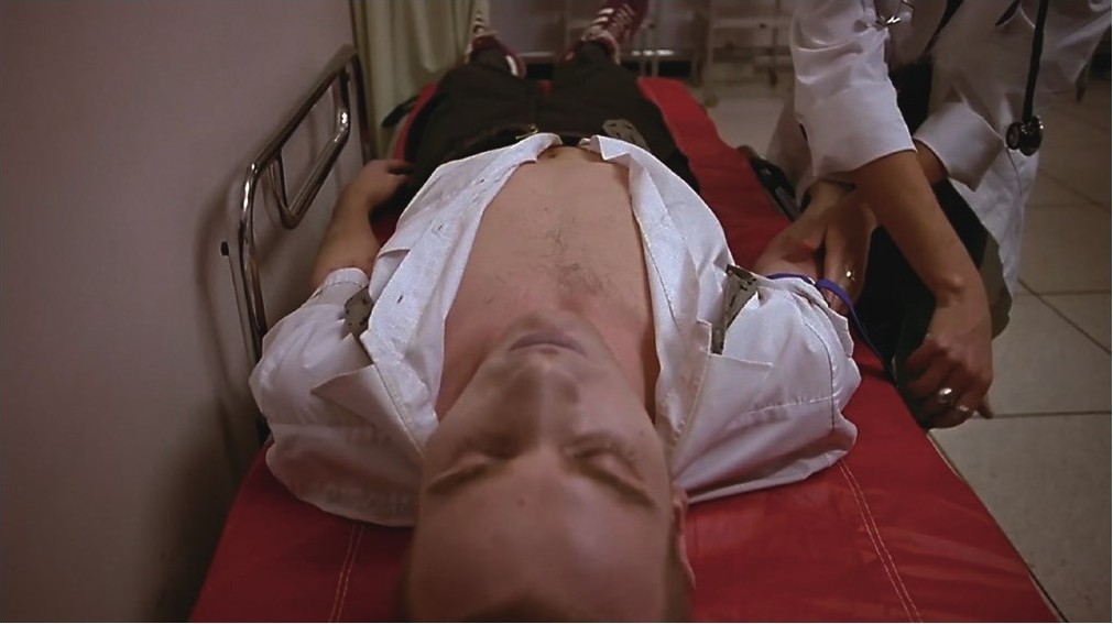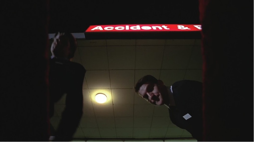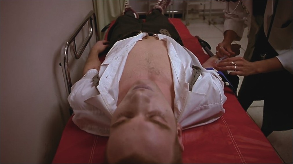 在电影《猜火车》中,在马克被送往医院这段情节中,就用到了客观与主观相切换的镜头,如图2-3-5至图2-3-12所示,其中图2-3-5、图2-3-8、图2-3-9和图2-3-10为客观镜头,图2-3-6、图2-3-7、图2-3-11和图2-3-12为主观镜头。主观镜头就是马克的视角,主观镜头在这里都采用了快速切换客观镜头的方式,体现了马克迷离、不清醒的状态,同时也增强了影片的节奏感。