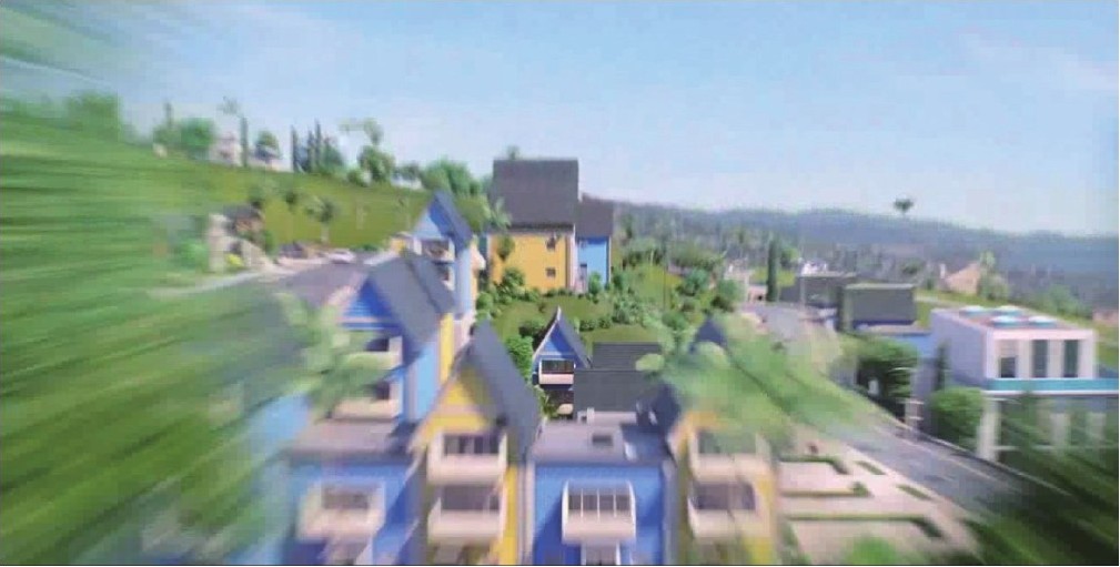 很多动画片的拍摄非常青睐这种前移镜头,因为动画片往往不需要考虑拍摄上的困难,反而能够在前移镜头中带着观众在其美好的世界中尽情穿梭,观看绚烂场景的同时,体会刺激和欢乐。在动画电影《穿靴子的猫》开篇,就有一段以穿靴子的猫为主观视角的前移镜头,交代了其奔跑的场景,如图2-2-91至图2-2-96所示。