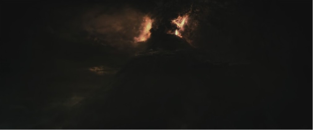 在影视剧拍摄中,摇镜头也经常和其他镜头运动结合到一起进行,尤其是摇臂机的作用下,摇镜头通常是和升、降镜头混合到一起,形成摇升或摇降,这样的画面更能很好地交代大的场景。在电影《指环王:魔戒再现》中,开篇就有一个摇升镜头,摇摄行军的部队再升镜头到火山,如图2-2-39至图2-2-42所示。