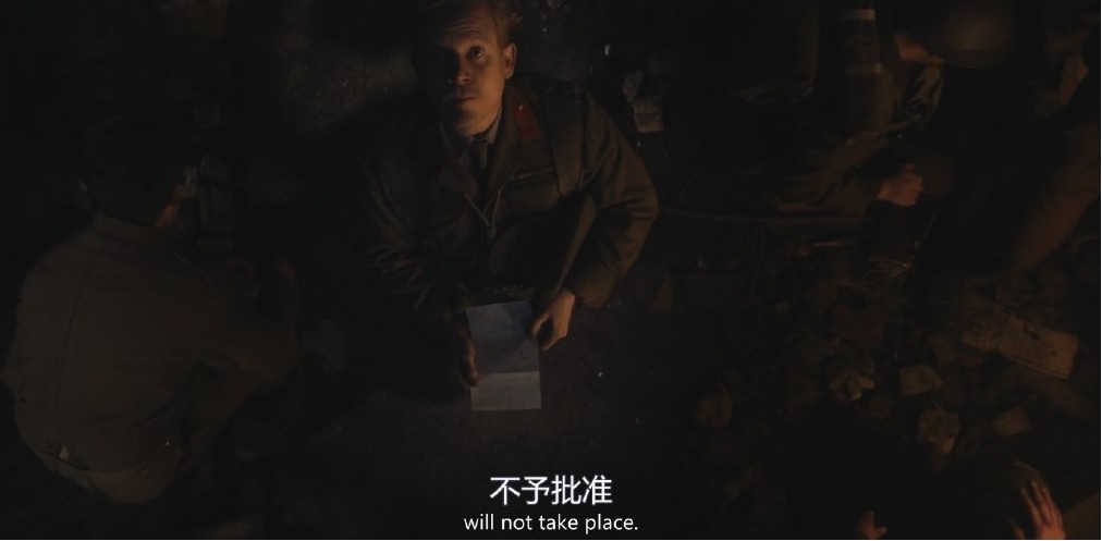 缓慢的拉镜头也有助于表现人物内心的情绪和艺术氛围,在电影《至暗时刻》中出现两段很经典的拉镜头。第一段拉镜头是留守在加莱的尼克逊准将看到丘吉尔发来“不予撤退”的电报时,逐渐拉起的镜头,既表明了士兵们所处的恶劣环境,也表现了尼克逊准将当时的绝望,同时也渲染了悲壮的氛围,如图2-2-15至图2-2-20所示。接着轰炸机进入,同时画面开始了反推镜头,交代了部队被轰炸、加莱的陷落,如图2-2-21至图2-2-24所示。